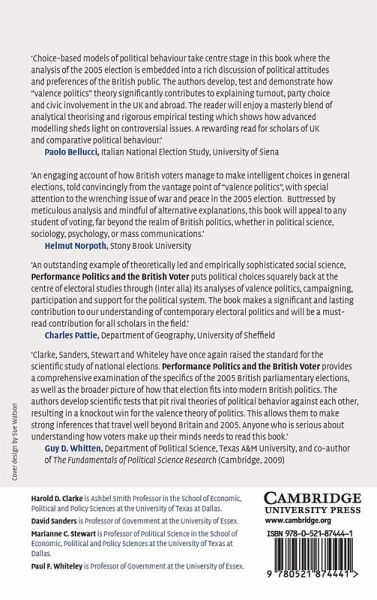 What matters most to voters when they choose their leaders? This book suggests that performance politics is at the heart of contemporary democracy, with voters forming judgments about how well competing parties and leaders perform on important issues. Given the high stakes and uncertainty involved, voters rely heavily on partisan cues and party leader images as guides to electoral choice. However, the authors argue that the issue agenda of British politics has changed markedly in recent years. A cluster of concerns about crime, immigration and terrorism now mix with perennial economic and public service issues. Since voters and parties often share the same positions on these issues, political competition focuses on who can do the best job. This book shows that a model emphasizing flexible partisan attachments, party leader images and judgments of party competence on key issues can explain electoral choice in contemporary Britain.