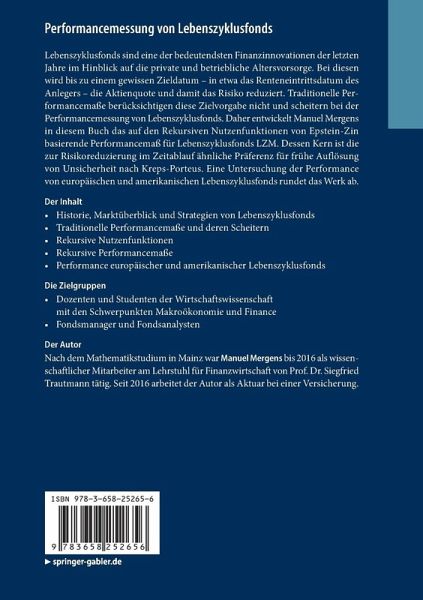 Lebenszyklusfonds sind eine der bedeutendsten Finanzinnovationen der letzten Jahre im Hinblick auf die private und betriebliche Altersvorsorge. Bei diesen wird bis zu einem gewissen Zieldatum - in etwa das Renteneintrittsdatum des Anlegers - die Aktienquote und damit das Risiko reduziert. Traditionelle Performancemaße berücksichtigen diese Zielvorgabe nicht und scheitern bei der Performancemessung von Lebenszyklusfonds. Daher entwickelt Manuel Mergens in diesem Buch das auf den Rekursiven Nutzenfunktionen von Epstein-Zin basierende Performancemaß für Lebenszyklusfonds LZM. Dessen Kern ist die zur Risikoreduzierung im Zeitablauf ähnliche Präferenz für frühe Auflösung von Unsicherheit nach Kreps-Porteus. Eine Untersuchung der Performance von europäischen und amerikanischen Lebenszyklusfonds rundet das Werk ab.