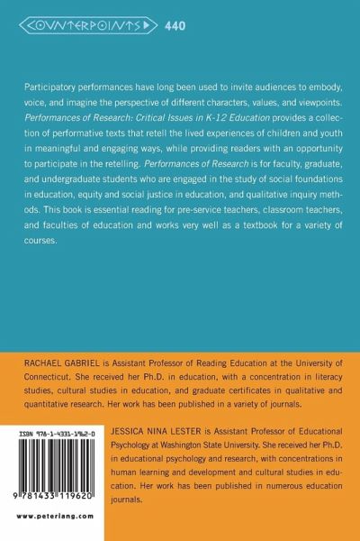 Participatory performances have long been used to invite audiences to embody, voice, and imagine the perspective of different characters, values, and viewpoints. Performances of Research: Critical Issues in K-12 Education provides a collection of performative texts that retell the lived experiences of children and youth in meaningful and engaging ways, while providing readers with an opportunity to participate in the retelling. Performances of Research is for faculty, graduate, and undergraduate students who are engaged in the study of social foundations in education, equity and social justice in education, and qualitative inquiry methods. This book is essential reading for pre-service teachers, classroom teachers, and faculties of education and works very well as a textbook for a variety of courses.