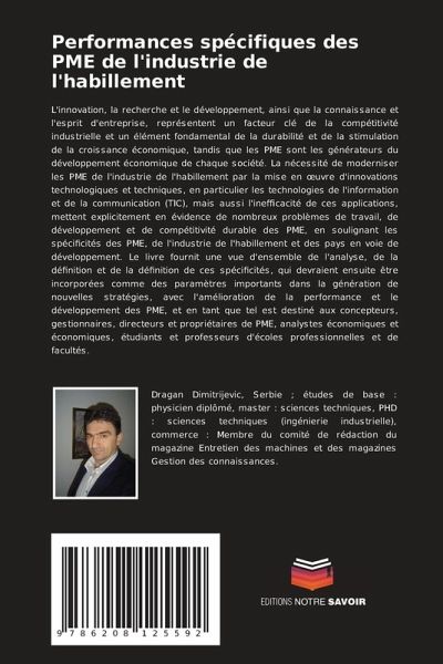 L'innovation, la recherche et le développement, ainsi que la connaissance et l'esprit d'entreprise, représentent un facteur clé de la compétitivité industrielle et un élément fondamental de la durabilité et de la stimulation de la croissance économique, tandis que les PME sont les générateurs du développement économique de chaque société. La nécessité de moderniser les PME de l'industrie de l'habillement par la mise en oeuvre d'innovations technologiques et techniques, en particulier les technologies de l'information et de la communication (TIC), mais aussi l'inefficacité de ces applications, mettent explicitement en évidence de nombreux problèmes de travail, de développement et de compétitivité durable des PME, en soulignant les spécificités des PME, de l'industrie de l'habillement et des pays en voie de développement. Le livre fournit une vue d'ensemble de l'analyse, de la définition et de la définition de ces spécificités, qui devraient ensuite être incorporées comme des paramètres importants dans la génération de nouvelles stratégies, avec l'amélioration de la performance et le développement des PME, et en tant que tel est destiné aux concepteurs, gestionnaires, directeurs et propriétaires de PME, analystes économiques et économiques, étudiants et professeurs d'écoles professionnelles et de facultés.