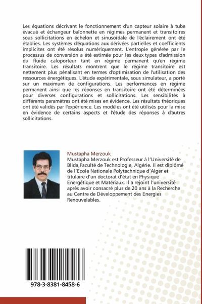 Les équations décrivant le fonctionnement d'un capteur solaire à tube évacué et échangeur baïonnette en régimes permanent et transitoires sous sollicitations en échelon et sinusoïdale de l'éclairement ont été établies. Les systèmes d'équations aux dérivées partielles et coefficients implicites ont été résolus numériquement. L'entropie générée par le processus de conversion a été estimée pour les deux types d'admission du fluide caloporteur tant en régime permanent qu'en régime transitoire. Les résultats montrent que le régime transitoire est nettement plus pénalisant en termes d'optimisation de l'utilisation des ressources énergétiques. L'étude expérimentale, sous simulateur, a porté sur un maximum de configurations. Les performances en régime permanent ainsi que les réponses en transitoire ont été déterminées pour diverses configurations et sollicitations. Les sensibilités à différents paramètres ont été mises en évidence. Les résultats théoriques ont été validés par l'expérience. Les modèles ont été utilisés pour la mise en évidence de certains aspects et l'étude des réponses à d'autres sollicitations.