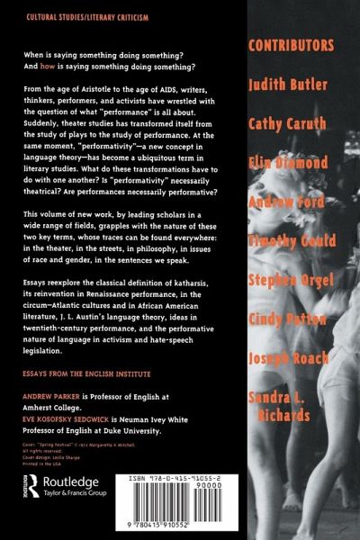 From the age of Aristotle to the age of AIDS, writers, thinkers, performers and activists have wresteled with what "performance" is all about. At the same moment, "performativity"--a new concept in language theory--has become a ubiquitous term in literary studies. This volume grapples with the nature of these two key terms whose traces can be found everywhere: in the theatre, in the streets, in philosophy, in questions of race and gender, and in the sentences we speak.