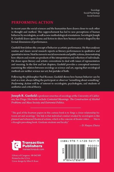 In recent years the social sciences and the humanities have drawn closer to each other in thought and method. This rapprochement has led to new perceptions of human behaviour by sociologists, as well as new methodological orientations. Sociologist Joseph R. Gusfield draws upon drama and fiction to show how human action is shaped by the formal dimensions of performance. Gusfield first defines the concept of behaviour as artistic performance. He then analyses routine and classic social research reports as literary performances in qualitative and quantitative terms. Next he moves to social movements and public actions, demonstrating how objects and events are products of the interpretation and reflection of individuals. He draws upon literary and artistic conventions to deal with issues of representation and meaning. In the first and last chapters, Gusfield provides a conceptual summary examining the relation between sociology as science and art, arguing that sociological methods are neither science nor art, but partake of both. Following the philosopher Paul Ricouer, Gusfield shows how human behaviour can be read as a text, always telling the participant or observer "something about something." Performing Action will be of interest to sociologists, psychologists, and students of aesthetics and critical theory.