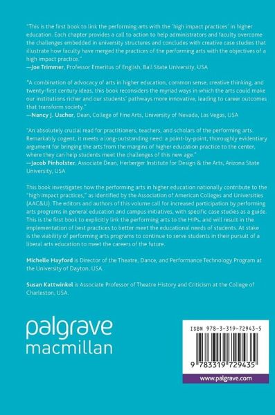 This book investigates how the performing arts in higher education nationally contribute to the "high impact practices," as identified by the Association of American Colleges and Universities (AACU). Using the well-known map of the HIPs for illustrating the centrality of performing arts practices in higher education, the editors and authors of this volume call for increased participation by performing arts programs in general education and campus initiatives, with specific case studies as a guide. Performing arts contribute to the efforts of their institution in delivering a strong liberal arts education that uniquely serves students to meet the careers of the future. This is the first book to explicitly link the performing arts to the HIPs, and will result in the implementation of best practices to better meet the educational needs of students. At stake is the viability of performing arts programs to continue to serve students in their pursuit of a liberal arts education.