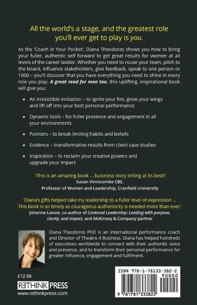 All the world's a stage, and the greatest role you'll ever get to play is you. As the 'Coach in Your Pocket', Diana Theodores shows you how to bring your fuller, authentic self forward to get great results for women at all levels of the career ladder. Whether you need to rouse your team, pitch to the board, influence stakeholders, give feedback, speak to one person or 1000 - you'll discover that you have everything you need to shine in every role you play. A great read for men too, this uplifting, inspirational book will give you: • An irresistible invitation - to ignite your fire, grow your wings and lift off into your best personal performance • Dynamic tools - for fuller presence and engagement in all your environments • Pointers - to break limiting habits and beliefs • Evidence - transformative results from client case studies • Inspiration - to reclaim your creative powers and upgrade your impact