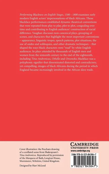 Performing Blackness on English Stages, 1500-1800 examines early modern English actors' impersonations of black Africans. Those blackface performances established dynamic theatrical conventions that were repeated from play to play, plot to plot, congealing over time and contributing to English audiences' construction of racial difference. Vaughan discusses non-canonical plays, grouping of scenes, and characters that highlight the most important conventions - appearance, linguistic tropes, speech patterns, plot situations, the use of asides and soliloquies, and other dramatic techniques - that shaped the ways black characters were 'read' by white English audiences. In plays attended by thousands of English men and women from the sixteenth century to the end of the eighteenth, including Titus Andronicus, Othello and Oroonoko, blackface was a polyphonic signifier that disseminated distorted and contradictory, yet compelling, images of black Africans during the period in which England became increasingly involved in the African slave trade.