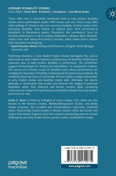 Chapter 1: Disability and the Work of Performance in Early Modern England, Lindsey Row-Heyveld.- Chapter 2: "By the Knife and Fire": Conceptions of Surgery and Disability in Early Modern Medical Treatises, Jodie Austin.- Chapter 3: "'Turn it to a Crutch': Disability and Swordsmanship in The Little French Lawyer, Matthew Carter.- Chapter 4: Mutism and Feminine Silence: Gender, Performance, and Disability in Epicoene, Melissa Geil.- Chapter 5: Contented Cuckolds: Infertility and Queer Reproductive Practice inMiddleton's A Chaste Maidin Cheapside and Macchiavelli's Mandragola, Simone Chess.- Chapter 6: Reading Shakespeare After Neurodiversity, Wes Folkerth.- Chapter 7: Enabling Rabies in King Lear, Avi Mendelson.- Chapter 8: Limping and Lameness on the Early Modern Stage, Susan Anderson.- Chapter 9: "Lame Humor" in Beaumont and Fletcher's Love's Pilgrimage,Joyce Boro.- Chapter 10: Syphilis Patches: Form and Disability History in The Knight of the Burning Pestle, Nancy Simpson-Younger.- Chapter 11: Sign Gain to Deaf Gain: Early Modern Manual Rhetoric and Modern Shakespeare Performances, Jennifer Nelson.- Chapter 12: "'This is miching mallecho. It means mischief': Problematizing Representations of Actors with Down Syndrome in Growing Up Downs, Sarah Olive.