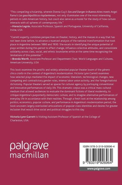 This book examines the prolific and widely-attended popular theater boom of the género chico criollo in the context of Argentina's modernization. Victoria Lynn Garrett examines how selected plays mediated the impact of economic liberalism, technological changes, new competing and contradictory gender roles, intense labor union activity, and the foreign/nativist dichotomy. Popular theaters served as spaces for cultural agency by portraying conventional and innovative performances of daily life. This dramatic corpus was a critical mass cultural medium that allowed audiences to evaluate the dominant fictions of liberal modernity, to critique Argentina's purportedly democratic culture, and to imagine alternative performances of everyday life in accordance with their realities. Through a fresh look at the relationship among politics, economics, popular culture, and performance in Argentina's modernization period, the book uncovers largely overlooked articulations of popular-classidentities and desires for greater inclusion that would drive social and political struggles to this day.