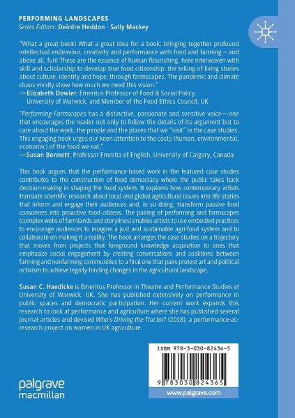 This book argues that the performance-based work in the featured case studies contributes to the construction of food democracy where the public takes back decision-making in shaping the food system. It explores how contemporary artists translate scientific research about local and global agricultural issues into life stories that inform and engage their audiences and, in so doing, transform passive food consumers into proactive food citizens. The pairing of performing and farmscapes (complex webs of farmlands and storylines) enables artists to use embodied practices to encourage audiences to imagine a just and sustainable agri-food system and to collaborate on making it a reality. The book arranges the case studies on a trajectory that moves from projects that foreground knowledge acquisition to ones that emphasize social engagement by creating conversations and coalitions between farming and nonfarming communities to a final one that pairs protest art and political activismto achieve legally-binding changes in the agricultural landscape.