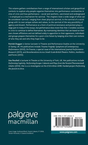 This volume gathers contributions from a range of international scholars and geopolitical contexts to explore why people organise themselves into performance communities in sites of crisis and how performance - social and aesthetic, sanctioned and underground - is employed as a mechanism for survival. The chapters treat a wide range of what can be considered 'survival', ranging from sheer physical survival, to the survival of a social group with its own unique culture and values, to the survival of the very possibility of agency and dissent. Performance as a form of political resistance and protest plays a large part in many of the essays, but performance does more than that: it enables societies in crisis to continue to define themselves. By maintaining identities that are based on their own chosen affiliations and not defined solely in opposition to their oppressors, individuals and groups prepare themselves for a post-crisis future by keeping alive their own notions of who they areand who they hope to be.