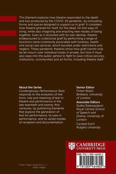 This Element discusses how theatre grieved for itself, for the dead, for lost ways of living, while also imagining and enacting new modes of being together. It shows how grief must seep into the public sphere to fight to save health and social care services, institutions, communities and art forms, including theatre.