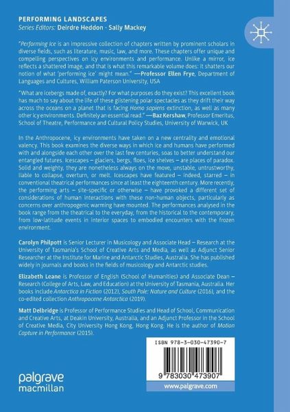In the Anthropocene, icy environments have taken on a new centrality and emotional valency. This book examines the diverse ways in which ice and humans have performed with and alongside each other over the last few centuries, so as to better understand our entangled futures. Icescapes - glaciers, bergs, floes, ice shelves - are places of paradox. Solid and weighty, they are nonetheless always on the move, unstable, untrustworthy, liable to collapse, overturn, or melt. Icescapes have featured - indeed, starred - in conventional theatrical performances since at least the eighteenth century. More recently, the performing arts - site-specific or otherwise - have provoked a different set of considerations of human interactions with these non-human objects, particularly as concerns over anthropogenic warming have mounted. The performances analysed in the book range from the theatrical to the everyday, from the historical to the contemporary, from low-latitude events in interior spaces to embodied encounters with the frozen environment.