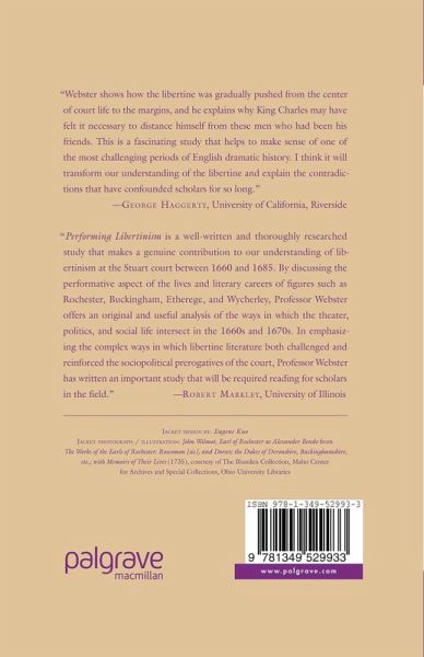 "Performing Libertinism is a well-written and thoroughly researched study that makes a genuine contribution to our understanding of libertinism at the Stuart court between 1660 and 1685. By discussing the performative aspect of the lives and literary careers of figures such as Rochester, Buckingham, Etherege, and Wycherley, Professor Webster offers an original and useful analysis of the ways in which the theater, politics, and social life intersect in the 1660s and 1670s. In emphasizing the complex ways in which libertine literature both challenged and reinforced the sociopolitical prerogatives of the court, Professor Webster has written an important study that will be required reading for scholars in the field." - Robert Markley, University of Illinois
