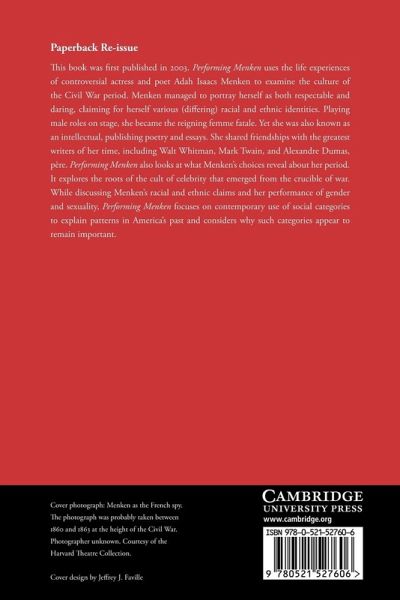 This book was first published in 2003. Performing Menken uses the life experiences of controversial actress and poet Adah Isaacs Menken to examine the culture of the Civil War period. Menken managed to portray herself as both respectable and daring, claiming for herself various (differing) racial and ethnic identities. Playing male roles on stage, she became the reigning femme fatale. Yet she was also known as an intellectual, publishing poetry and essays. She shared friendships with the greatest writers of her time, including Walt Whitman, Mark Twain, and Alexandre Dumas, père. Performing Menken also looks at what Menken's choices reveal about her period. It explores the roots of the cult of celebrity that emerged from the crucible of war. While discussing Menken's racial and ethnic claims and her performance of gender and sexuality, Performing Menken focuses on contemporary use of social categories to explain patterns in America's past and considers why such categories appear to remain important.