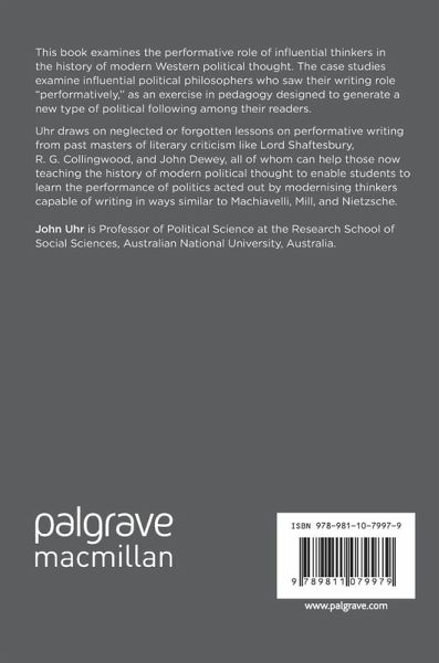 This book examines the performative role of influential thinkers in the history of modern Western political thought. The case studies examine influential political philosophers who saw their writing role 'performatively', as an exercise in pedagogy designed to generate a new type of political following among their readers. Machiavelli, Mill and Nietzsche wrote classic works in political theory (The Prince, On Liberty, Genealogy of Morals) to reform and reshape their readers' ability to think and act politically. Thinkers become performative through what they write in their public performance; and contemporary academic teachers can use this to great pedagogical effect in helping students 'get the point' of political theorising. This book examines how a small sample of classic theoretical performers wrote their remarkable public works.