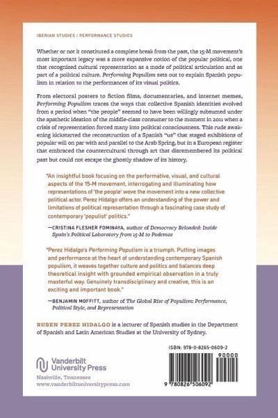 Whether or not it constituted a complete break from the past, the 15-M movement's most important legacy was a more expansive notion of the popular political, one that recognized cultural representation as a mode of political articulation and as part of a political culture. In an effort to understand the populist cycle inaugurated by 15-M, and to do so beyond a series of narrated events, Performing Populism sets out to explain Spanish populism in relation to the performances of its visual politics. The book's first part examines how the 15-M movement created a new way of seeing that in turn led to a new way of doing politics in Spain. Part Two focuses on the multiple ramifications of that new vision once the people stopped marching and the movement became less visible. From electoral posters to fiction films, documentaries, and internet memes, Performing Populism traces the ways that collective Spanish identities evolved from a period when "the people" seemed to have been willingly subsumed under the apathetic ideation of the middle-class consumer to the moment in 2011 when a crisis of representation forced many into political consciousness. This rude awakening kickstarted the reconstruction of a Spanish "us" that staged exhibitions of popular will on par with and parallel to the Arab Spring, but in a European register that embraced the countercultural through art that disremembered its political past but could not escape the ghostly shadow of its history.
