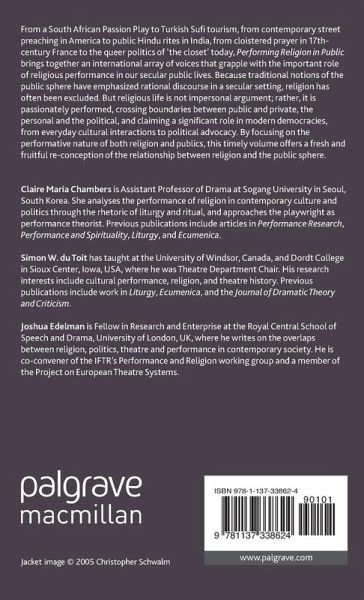 List of Illustrations Acknowledgements Notes on Contributors Introduction: The Public Problem of Religious Doings; Claire Maria Chambers, Simon W. du Toit and Joshua Edelman PART I: PUBLICS AND THE NON-DEMOCRATIC STATE 1. The Market for Argument; Simon W. du Toit 2. Public Acts of Private Devotion: From Silent Prayer to Ceremonies in France's Early Seminaries; Joy Palacios 3. The Durban Passion Play: Religious Performance, Power and Difference; Michael Lambert and Tamantha Hammerschlag Discussion PART II: VISCERAL PUBLICS 4. Church on/as Stage: Stewart Hedlam's Rhetorical Theology; Tom Grimwood and Peter Yeandle 5. The Intolerable, Intimate Public of Contemporary American Street Preaching; Joshua Edelman 6. Faith, Fright, and Excessive Feeling; Kris Messer Discussion PART III: PUBLICS AND COMMODIFICATION 7. Congregations, Audiences, Actors: Religious Performance and the Individual in Nineteenth-Century Nottingham; Jo Robinson and Lucie Sutherland 8. Sufi Ceremonies in Private and Public; Esra Çizmeci 9. From Religion to Culture: The Performative P?j? and Spectacular Religion in India; Saayan Chattopadhyay Discussion PART IV: EPHEMERAL PUBLICS 10. Coming Out of the (Confessional) Closet: Christian Performatives, Queer Performativities; Stephen D. Seely 11. Performing Jewish Sexuality: Mikvah Spaces in Orthodox Jewish Publics; Shira Schwartz 12. Busking and the Performance of Generosity: A Political Economy of the Spiritual Gift; Claire Maria Chambers Discussion