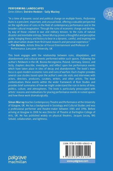 This book engages with the relationship between ruins, dilapidation, and abandonment and cultural events performed within such spaces. Following the author's fieldwork in the UK, Bosnia Herzegovina, Poland, Germany, Greece, and Sicily, chapters describe, investigate, and reflect upon live performance events which have taken place in sites of decay and abandonment. The book's main focus is upon modern economic ruins and ruins of warfare. Each chapter provides several case studies based upon the author's own site visits and interviews with actors, directors, producers, curators, writers, and other artists. The book contextualises these events within the wider framework of Ruin Studies and provides brief summaries of how we might understand the ruin in terms of time, politics, culture, and atmospheres. The book is particularly preoccupied with artists' reasons and motivations for placing performance events in ruined spaces and how these work dramaturgically.