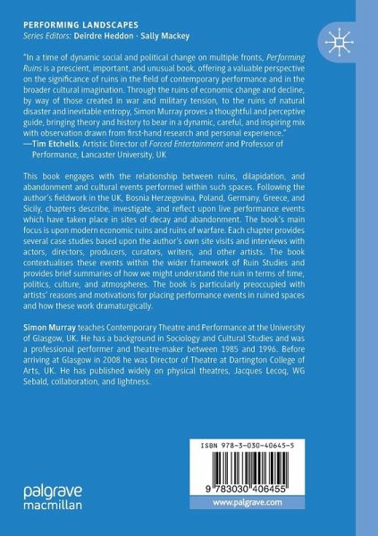 This book engages with the relationship between ruins, dilapidation, and abandonment and cultural events performed within such spaces. Following the author's fieldwork in the UK, Bosnia Herzegovina, Poland, Germany, Greece, and Sicily, chapters describe, investigate, and reflect upon live performance events which have taken place in sites of decay and abandonment. The book's main focus is upon modern economic ruins and ruins of warfare. Each chapter provides several case studies based upon the author's own site visits and interviews with actors, directors, producers, curators, writers, and other artists. The book contextualises these events within the wider framework of Ruin Studies and provides brief summaries of how we might understand the ruin in terms of time, politics, culture, and atmospheres. The book is particularly preoccupied with artists' reasons and motivations for placing performance events in ruined spaces and how these work dramaturgically.