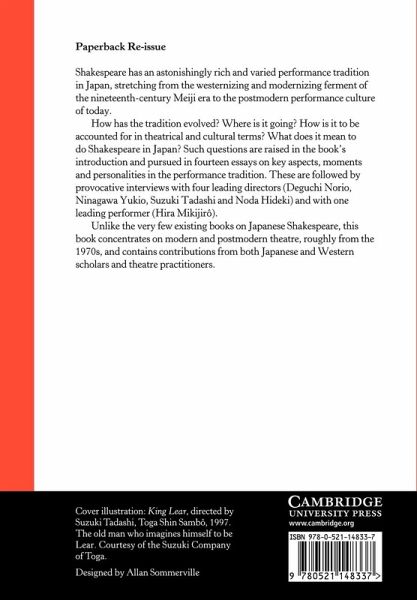 Shakespeare has an astonishingly rich and varied performance tradition in Japan, stretching from the Westernizing and modernizing ferment of the nineteenth-century Meiji era to the postmodern performance culture. How has the tradition evolved? Where is it going? How is it to be accounted for in theatrical and cultural terms? What does it mean to perform Shakespeare in Japan? Such questions are raised in this 2001 book's introduction and pursued in fourteen essays on key aspects, moments and personalities in the performance tradition. These are followed by provocative interviews with four leading directors (Deguchi Norio, Ninagawa Yukio, Suzuki Tadashi and Noda Hideki) and with one leading performer (Hira Mikijiro). Unlike the very few existing books on Japanese Shakespeare, this book concentrates on modern and postmodern theatre, from c.1970, and contains contributions from both Japanese and Western scholars and theatre practitioners.