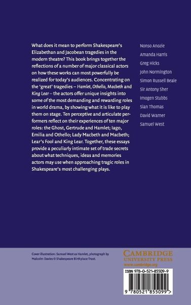 What does it mean to perform Shakespeare's Elizabethan and Jacobean tragedies in the modern theatre? This book brings together the reflections of a number of major classical actors on how these works can most powerfully be realized for today's audiences. Concentrating on the 'great' tragedies - Hamlet, Othello, Macbeth and King Lear - the actors offer unique insights into some of the most demanding and rewarding roles in world drama, by showing what it is like to play them on stage. Ten perceptive and articulate performers reflect on their experiences of ten major roles: the Ghost, Gertrude and Hamlet; Iago, Emilia and Othello; Lady Macbeth and Macbeth; Lear's Fool, and King Lear. Together, these essays provide a peculiarly intimate set of trade secrets about what techniques, ideas and memories actors may use when approaching tragic roles in Shakespeare's most challenging plays.