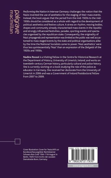 'In Performing the Nation, Nadine Rossol highlights continuities in German political representation that transcended the historical divide of 1933, and, in so doing, she challenges the notion that the Nazis invented the mass spectacle...One of the greatest strengths of Rossol's study is its depiction of the gradual evolution in the scale and assertiveness of the Weimar Republic's self-celebration. Rossol's study provides another important example of the continuities that linked the Weimar Republic and the Nazi regime, and she incorporates a great deal of material in this book that will be of value to cultural historians of the period.'