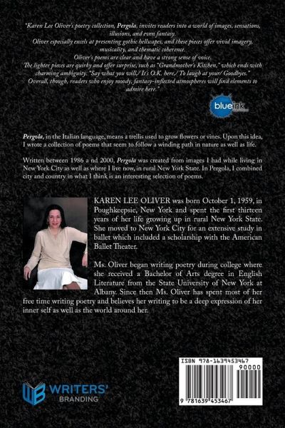Book Review: "Karen Lee Oliver's poetry collection, Pergola, invites readers into a world of images, sensations, illusions, and even fantasy. Oliver especially excels at presenting gothic hellscapes, and these pieces offer vivid imagery, musicality, and thematic coherence. Oliver's poems are clear and have a strong sense of voice. The lighter pieces are quirky and offer surprise, such as "Grandmother's Kitchen," which ends with charming ambiguity. "Say what you will,/ It's O.K. here,/ To laugh at your/ Goodbyes." Overall, though, readers who enjoy moody, fantasy-inflected atmospheres will find elements to admire here." - BlueInk Review Book Synopsis: Pergola, in the Italian language, means a trellis used to grow flowers or vines. Upon this idea, I wrote a collection of poems that seem to follow a winding path in nature as well as life. Written between 1986 and 2000, Pergola was created from images I had while living in New York City as well as where I live now, in rural New York State. In Pergola, I combined city and country in what I think is an interesting selection of poems. Autobiography: KAREN LEE OLIVER was born October 1, 1959, in Poughkeepsie, New York and spent the first thirteen years of her life growing up in rural New York State. She moved to New York City for an extensive study in ballet which included a scholarship with the American Ballet Theater. Ms. Oliver began writing poetry during college where she received a Bachelor of Arts degree in English Literature from the State University of New York at Albany. Since then Ms. Oliver has spent most of her free time writing poetry and believes her writing to be a deep expression of her inner self as well as the world around her.