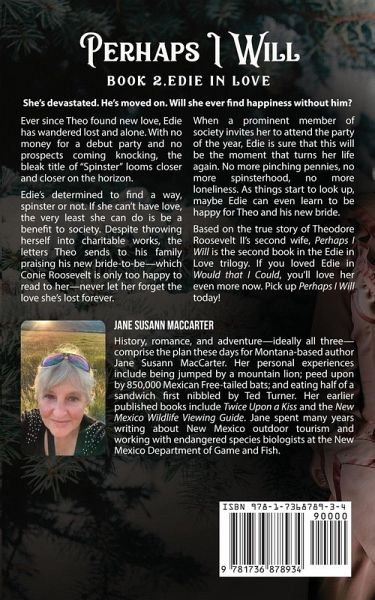 She's devastated. He's moved on. Will she ever find happiness without him? Ever since Theo found new love, Edie has wandered lost and alone. With no money for a debut party and no prospects coming knocking, the bleak title of "Spinster" looms closer and closer on the horizon. Edie's determined to find a way, spinster or not. If she can't have love, the very least she can do is be a benefit to society. Despite throwing herself into charitable works, the letters Theo sends to his family praising his new bride-to-be-which Conie Roosevelt is only too happy to read to her-never let her forget the love she's lost forever. When a prominent member of society invites her to attend the party of the year, Edie is sure that this will be the moment that turns her life again. No more pinching pennies, no more spinsterhood, no more loneliness. As things start to look up, maybe Edie can even learn to be happy for Theo and his new bride. Based on the true story of Theodore Roosevelt II's second wife, Perhaps I Will is the second book in the Edie in Love trilogy. If you loved Edie in Would that I Could, you'll love her even more now. Pick up Perhaps I Will today! History, romance, and adventure-ideally all three-comprise the plan these days for Montana-based author Jane Susann MacCarter. The Edie in Love trilogy is her latest work. Her personal experiences include being jumped by a mountain lion (don't ask); peed upon by 850,000 Mexican Free-tailed bats exiting a cave; and eating the other half of a sandwich first nibbled by Ted Turner (long story). Her earlier published books include Twice Upon a Kiss, (neolithic romance/contemporary time travel/medical drama), as well as the New Mexico Wildlife Viewing Guide (Defenders of Wildlife nature series.) Her career has included many years writing about New Mexico outdoor tourism-including the Santa Fe Visitor's Guide-followed by working with endangered species biologists at the New Mexico Department of Game and Fish.