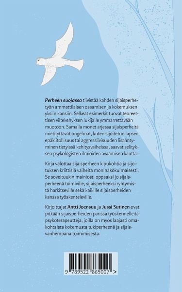Perheen suojassa tiivistää kahden sijaisperhetyön ammattilaisen osaamisen ja kokemuksen yksiin kansiin. Selkeät esimerkit tuovat teoreettisen viitekehyksen lukijalle ymmärrettävään muotoon. Samalla monet arjessa sijaisperheitä mietityttävät ilmiöt kuten sijoitetun lapsen epäkiitollisuus tai aggressiivisuuden lisääntyminen tietyissä kehitysvaiheissa saavat selityksen psykologisten ilmiöiden avaamisen kautta. Kirja avaa sijaisperheen kipukohtia ja sijoituksen kriittisiä vaiheita moninäkökulmaisesti. Se soveltuukin mainiosti oppaaksi jo sijaisperheenä toimiville, sijaisperheeksi ryhtymistä harkitseville sekä kaikille sijaisperheiden kanssa työs kenteleville. Kirjoittajat Antti Joensuu ja Jussi Sutinen ovat pitkään sijaisperheiden parissa työskennelleitä psykoterapeutteja, joilla on myös laajasti omakohtaista kokemusta tukiperheenä ja sijaisvanhempana toimimisesta.