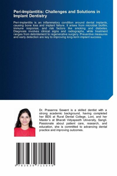 Peri-implantitis is an inflammatory condition around dental implants, causing bone loss and implant failure. It arises from microbial biofilm, immune response, and risk factors like smoking and diabetes. Diagnosis involves clinical signs and radiographs, while treatment ranges from debridement to regenerative surgery. Preventive measures and early detection are key to improving long-term implant success.