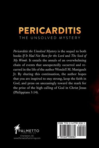 Pericarditis the Unsolved Mystery is the sequel to both books If It Had Not Been for the Lord and The Seed of My Womb. It entails the annals of an overwhelming chain of events that unexpectedly occurred and recurred in the life of the author Wendell M. Manigault Jr. By sharing this continuation, the author hopes that you are inspired to stay strong, keep the faith in God, and press on unceasingly toward the mark for the prize of the high calling of God in Christ Jesus (Philippians 3:14).