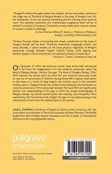 "Chappell's Perilous Passages relates the complex, almost miraculous, survival of the single text of The Book of Margery Kempe to the story of Kempe's own life, the 'palimpsest' of her own spiritual awakening and the claiming of her spiritual voice. This carefully researched and intellectually imaginative book will be of interest to scholars of medieval Christianity in many fields, from material culture to women's studies, to theology." - E. Ann Matter, William R. Kenan, Jr. Professor and Professor of Religious Studies, University of Pennsylvania, USA "Perilous Passages makes a fascinating and unique contribution to the study of Margery Kempe and her Book. Flawlessly researched, engagingly written and richly detailed, it carries readers on the many physical migrations of Kempe's manuscript through turbulent English Catholic history, while arguing that Kempe's purpose was to embody her own spiritual journey in textual form." - Amanda L. Capern, University of Hull, UK