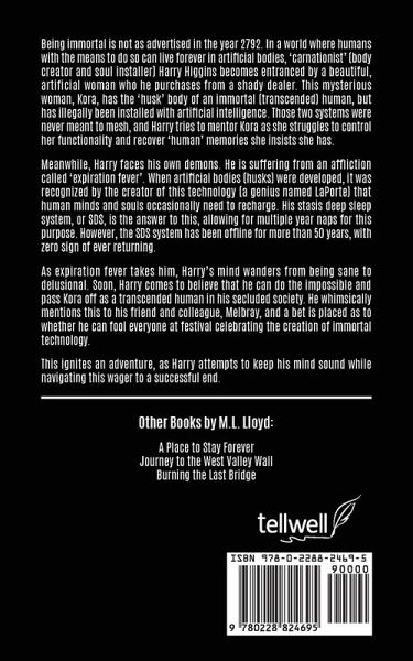 Being immortal is not as advertised in the year 2792. In a world where humans with the means to do so can live forever in artificial bodies, ‘carnationist’ (body creator and soul installer) Harry Higgins becomes entranced by a beautiful, artificial woman who he purchases from a shady dealer. This mysterious woman, Kora, has the ‘husk’ body of an immortal (transcended) human, but has illegally been installed with artificial intelligence. Those two systems were never meant to mesh, and Harry tries to mentor Kora as she struggles to control her functionality and recover ‘human’ memories she insists she has. Meanwhile, Harry faces his own demons. He is suffering from an affliction called ‘expiration fever’. When artificial bodies (husks) were developed, it was recognized by the creator of this technology (a genius named LaPorte) that human minds and souls occasionally need to recharge. His stasis deep sleep system, or SDS, is the answer to this, allowing for multiple year naps for this purpose. However, the SDS system has been offline for more than 50 years, with zero sign of ever returning. As expiration fever takes him, Harry’s mind wanders from being sane to delusional. Soon, Harry comes to believe that he can do the impossible and pass Kora off as a transcended human in his secluded society. He whimsically mentions this to his friend and colleague, Melbray, and a bet is placed as to whether he can fool everyone at festival celebrating the creation of immortal technology. This ignites an adventure, as Harry attempts to keep his mind sound while navigating this wager to a successful end.