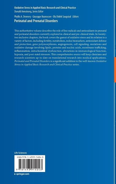 This authoritative volume describes the role of free radicals and antioxidants in prenatal and perinatal disorders currently explored in clinical and pre-clinical trials. In twenty-two inclusive chapters, the book covers the gamut of oxidative stress and its relation to a variety of factors, including fertility, metabolism, redox biomarkers, antioxidant defense and protection, gene polymorphisms, angiogenesis, cell signaling, mutations and oxidative damage involving lipids, proteins and nucleic acids, membrane trafficking, inflammation, mitochondrial dysfunction, alterations in immunological function, hypoxia, and post-natal stressors. This comprehensive source will keep clinicians and research scientists up-to-date on translational research into medical applications. Perinatal and Prenatal Disorders is a significant addition to the well-known Oxidative Stress in Applied Basic Research and Clinical Practice series.