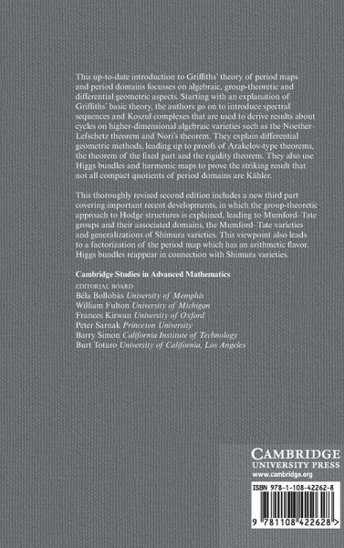 This up-to-date introduction to Griffiths' theory of period maps and period domains focusses on algebraic, group-theoretic and differential geometric aspects. The second edition has been thoroughly revised and now includes a new third section covering recent and important new developments in the field.