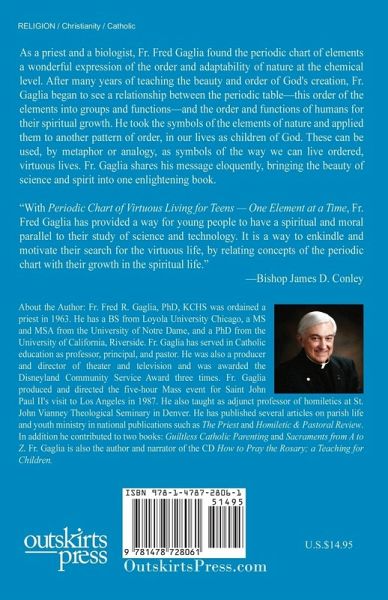 As a priest and a biologist, Fr. Fred Gaglia found the periodic chart of elements a wonderful expression of the order and adaptability of nature at the chemical level. After many years of teaching the beauty and order of God's creation, Fr. Gaglia began to see a relationship between the periodic table-this order of the elements into groups and functions-and the order and functions of humans for their spiritual growth. He took the symbols of the elements of nature and applied them to another pattern of order, in our lives as children of God. These can be used, by metaphor or analogy, as symbols of the way we can live ordered, virtuous lives. Fr. Gaglia shares his message eloquently, bringing the beauty of science and spirit into one enlightening book. "With Periodic Chart of Virtuous Living for Teens - One Element at a Time, Fr. Fred Gaglia has provided a way for young people to have a spiritual and moral parallel to their study of science and technology. It is a way to enkindle and motivate their search for the virtuous life, by relating concepts of the periodic chart with their growth in the spiritual life." -Bishop James D. Conley.