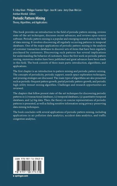 The chapters that follow present state-of-the-art techniques for discovering periodic patterns in (1) transactional databases, (2) temporal databases, (3) quantitative temporal databases, and (4) big data. Then, the theory on concise representations of periodic patterns is presented, as well as hiding sensitive information using privacy-preserving data mining techniques.