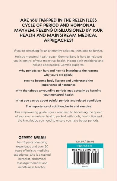 Are you trapped in the relentless cycle of period and hormonal mayhem, feeling disillusioned by your health and mainstream medical approaches? If you're searching for an alternative solution, then look no further. Holistic menstrual health coach Gemma Barry is here to help put you in control of your menstrual health. Mixing both traditional and holistic approaches, Gemma explores: Why periods can hurt and how to investigate the reasons why yours are painful How to become body literate and understand the importance of hormones Why the taboos surrounding periods may actually be harming your menstrual health What you can do about painful periods and related conditions The importance of nutrition, herbs and exercise This empowering guide is your roadmap to becoming the queen of your own menstrual health, packed with tools, health tips and the knowledge you need to ensure you have better periods.