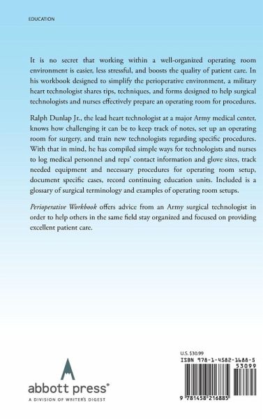 It is no secret that working within a well-organized operating room environment is easier, less stressful, and boosts the quality of patient care. In his workbook designed to simplify the perioperative environment, a military heart technologist shares tips, techniques, and forms designed to help surgical technologists and nurses effectively prepare an operating room for procedures. Ralph Dunlap Jr., the lead heart technologist at a major Army medical center, knows how challenging it can be to keep track of notes, set up an operating room for surgery, and train new technologists regarding specific procedures. With that in mind, he has compiled simple ways for technologists and nurses to log medical personnel and reps? contact information and glove sizes, track needed equipment and necessary procedures for operating room setup, document specific cases, record continuing education units. Included is a glossary of surgical terminology and examples of operating room setups. Perioperative Workbook offers advice from an Army surgical technologist in order to help others in the same field stay organized and focused on providing excellent patient care.