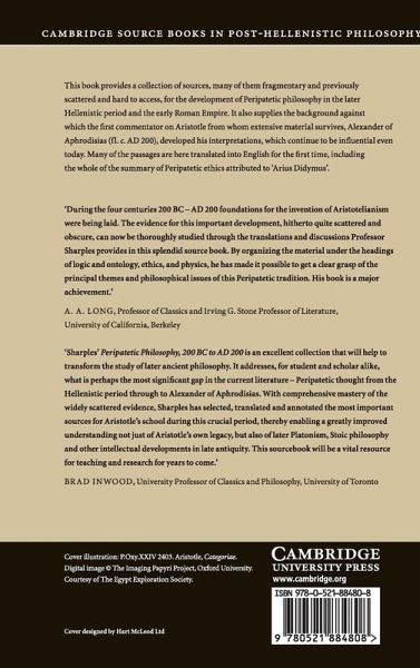 This book provides a collection of sources, many of them fragmentary and previously scattered and hard to access, for the development of Peripatetic philosophy in the later Hellenistic period and the early Roman Empire. It also supplies the background against which the first commentator on Aristotle from whom extensive material survives, Alexander of Aphrodisias (fl. c. AD 200), developed his interpretations which continue to be influential even today. Many of the passages are here translated into English for the first time, including the whole of the summary of Peripatetic ethics attributed to 'Arius Didymus'.
