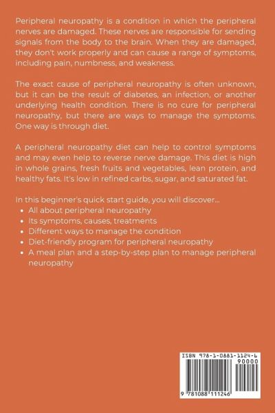 Peripheral neuropathy is a condition in which the peripheral nerves are damaged. These nerves are responsible for sending signals from the body to the brain. When they are damaged, they don't work properly and can cause a range of symptoms, including pain, numbness, and weakness. The exact cause of peripheral neuropathy is often unknown, but it can be the result of diabetes, an infection, or another underlying health condition. There is no cure for peripheral neuropathy, but there are ways to manage the symptoms. One way is through diet. A peripheral neuropathy diet can help to control symptoms and may even help to reverse nerve damage. This diet is high in whole grains, fresh fruits and vegetables, lean protein, and healthy fats. It's low in refined carbs, sugar, and saturated fat. In this beginner's quick start guide, you will discover...All about peripheral neuropathy Its symptoms, causes, treatments Different ways to manage the condition Diet-friendly program for peripheral neuropathy A meal plan and a step-by-step plan to manage peripheral neuropathy