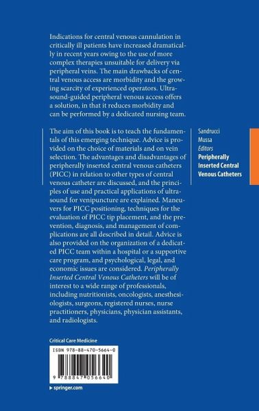 Indications for central venous cannulation in critically ill patients have increased dramatically, but central venous access has the drawbacks of morbidity and a scarcity of experienced operators. Ultrasound-guided peripheral venous access offers a solution, in that it reduces morbidity and can be performed by a dedicated nursing team. The aim of this book is to teach the fundamentals of this emerging technique. Advice is provided on choice of materials; maneuvers for positioning of peripherally inserted central venous catheters (PICCs), techniques for evaluation of PICC tip placement; prevention, diagnosis, and management of complications; and organization of a dedicated team within a hospital or a supportive care program. Legal and economic issues are also considered. The book will be of interest to a wide range of professionals, including nutritionists, oncologists, anesthesiologists, surgeons, registered nurses, nurse practitioners, physicians, physician assistants, and radiologists.