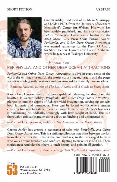 Garrett Ashley's debut short story collection, Periphylla, and Other Deep Ocean Attractions introduces a cast of characters both strange and strangely familiar: a father struggling to reconcile modern co-parenting with his past life as a yak, a brother and sister fighting to survive in an alligator-infested swamp, residents of a seaside town where the cadence of life and loss follows the heartbeat of the mythical Leviathan. Readers will find stories of reincarnation, zombification, and genetic modification-but most of all, a piercing self-awareness that invites us to laugh at the absurd while also reminding us, in all seriousness, that what some may call "fantasy" often tells the truest story.