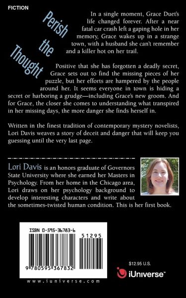 In a single moment, Grace Duet's life changed forever. After a near fatal car crash left a gaping hole in her memory, Grace wakes up in a strange town, with a husband she can't remember and a killer hot on her trail. Positive that she has forgotten a deadly secret, Grace sets out to find the missing pieces of her puzzle, but her efforts are hampered by the people around her. It seems everyone in town is hiding a secret or harboring a grudge-including Grace's new groom. And for Grace, the closer she comes to understanding what transpired in her missing days, the more danger she finds herself in. Written in the finest tradition of contemporary mystery novelists, Lori Davis weaves a story of deceit and danger that will keep you guessing until the very last page.