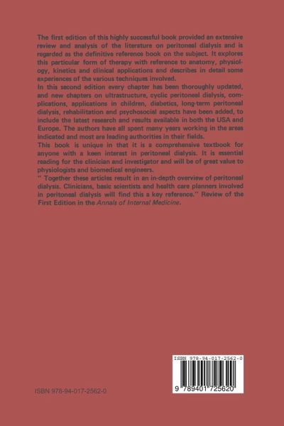 `The book fills a need for anyone who wishes ready access to most of the well documented literature to date in the areas of anatomy, physiology, pharmacology and history.' Dialysis and Transplantation, 11:7 (1982) `An indepth overview of Peritoneal Dialysis. Clinicians, basic scientists, and health care planners involved in peritoneal dialysis will find this a key reference.' The Annals of Internal Medicine