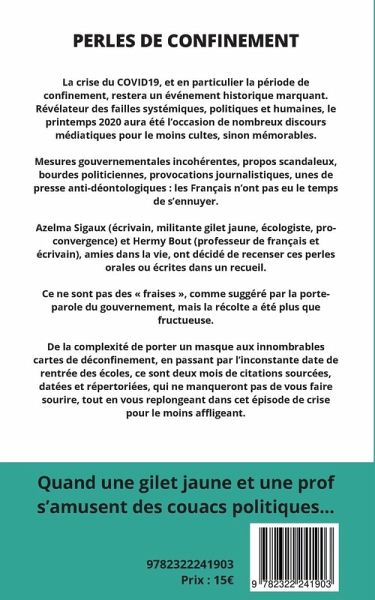 Quand une gilet jaune et une prof s'amusent des couacs politiques, voilà le résultat...La crise du COVID19, et en particulier la période de confinement, restera un événement marquant. Révélateur des failles systémiques, politiques et humaines, le printemps 2020 aura été l'occasion de nombreux discours médiatiques pour le moins cultes, sinon mémorables.Mesures gouvernementales incohérentes, propos scandaleux, bourdes politiciennes, provocations journalistiques, unes de presse anti-déontologiques : les Français n'ont pas eu le temps de s'ennuyer.Azelma Sigaux (écrivain, militante gilet jaune, écologiste, pro-convergence...) et Hermy Bout (professeur de français et écrivain), amies dans la vie, ont décidé de recenser ces perles orales ou écrites dans un recueil.Ce ne sont pas des « fraises », comme suggéré par la porte-parole du gouvernement, mais la récolte a été plus que fructueuse.De la complexité de porter un masque aux innombrables cartes de déconfinement, en passant par l'inconstante date de rentrée des écoles, ce sont deux mois de citations sourcées, datées et répertoriées, qui ne manqueront pas de vous faire sourire, tout en vous replongeant dans cet épisode de crise pour le moins affligeant.