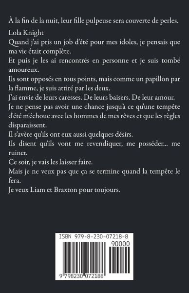 À la fin de la nuit, leur fille pulpeuse sera couverte de perles. Lola Knight Quand j'ai pris un job d'été pour mes idoles, je pensais que ma vie était complète. Et puis je les ai rencontrés en personne et je suis tombé amoureux. Ils sont opposés en tous points, mais comme un papillon par la flamme, je suis attiré par les deux. J'ai envie de leurs caresses. De leurs baisers. De leur amour. Je ne pense pas avoir une chance jusqu'à ce qu'une tempête d'été m'échoue avec les hommes de mes rêves et que les règles disparaissent. Il s'avère qu'ils ont eux aussi quelques désirs. Ils disent qu'ils vont me revendiquer, me posséder... me ruiner. Ce soir, je vais les laisser faire. Mais je ne veux pas que ça se termine quand la tempête le fera. Je veux Liam et Braxton pour toujours.