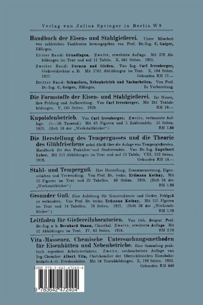 Erste Reihe.- Perlitgußeisen (Erste Mitteilung).- Das Perlitgußeisen, seine Herstellung, Festigkeitseigenschaften und Anwendungsmöglichkeiten.- Perlitgußeisen (Vortrag 1923).- Bemerkungen zum Perlitgußyerfahren.- Versuche mit Perlitguß.- Zweite Reihe.- Der Perlitguß in der praktischen Verwendung.- Gußeiserne Rauchgas-Vorwärmer für niedrigen und hohen Druck.- Perlitguß in der Wärmetechnik.- Dritte Reihe.- Die Abnutzung des Gußeisens bei gleitender Reibung.- Das Wachsen des Gußeisens.- Die Dichte von Grauguß und Lanz-Perlitguß, gemessen mit der Färbstoffdruckprüfung.- Die elektrische Leitfähigkeit von Grauguß.- Zur Dauerschlagprüfung.- Merkblätter der Studiengesellschaft für Veredelung von Gußeisen:.- 1. Prüfung von Gußeisen.- 2. Güteklassen von Maschinenguß.- Deutsche Reichspatente über Perlitguß:.- D. R. P. 301913.- D. R. P. 325250.- D. R. P. 417689.- Literaturübersicht.