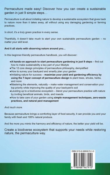 Permaculture made easy! Discover how you can create a sustainable garden in just 9 simple steps... Gardening remains one of the most prominent trends in the world right now, existing in many forms, shapes, and even sizes - ranging from something as simple as a lawn to purpose-built kitchen gardens, orchards, and more. However, in all these versions, there is one element that hardly gets addressed: sustainability. Conventional gardening practices - for something as simple as planting herbs or growing vegetables - might be green but are not truly eco-friendly. Excess water consumption and waste, soil degradation, and chemical pollutants all create a combined effect that hurts the environment that you live in. And this is where permaculture comes into play. Developed in the 1970s, permaculture is what you'd call a holistic practice, aimed at not only providing food security to individuals and communities but also restoring nature as a whole. Permaculture is all about imitating nature to develop a sustainable ecosystem that gives back to nature more than it takes away, all without using any damaging gardening or farming practices. In short, it's a truly green practice in every sense. Thankfully, it doesn't take much to start your own sustainable permaculture garden - no matter your skill level. And it all starts with observing nature around you... In this beginner-friendly permaculture handbook, you will discover: A hands-on approach to start permaculture gardening in just 9 steps - find out how to make sustainability a key part of your lifestyle The 12 core design principles of permaculture philosophy, demystified How to survey your backyard and smartly plan your garden Imitating nature for success - maximize your yield and gardening efficiency by using the 7-layer concept of permaculture design to plant trees, shrubs, herbs, and more Mastering the elements, naturally - make water management and conservation your top priority while improving the quality of your backyard's soil Leveling up to a biodiverse ecosystem - blend your permaculture practice with nature by inviting beneficial animals, birds, and insects How to take care of your garden using simple management techniques, zero-waste practices, and natural pest management And much more. Because permaculture brings a comforting layer of food security, it can provide you and your family with fresh and 100% natural produce. And the more you mimic the harmony and efficiency of nature, the better your yield will be. So, are you ready to make nature your permanent gardening partner? Create a biodiverse ecosystem that supports your needs while restoring nature, the permaculture way!
