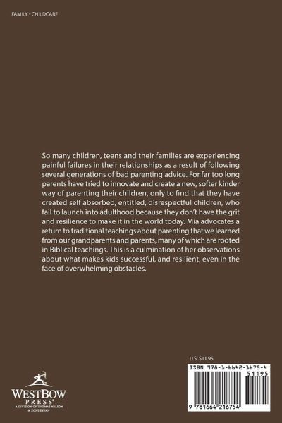 So many children, teens and their families are experiencing painful failures in their relationships as a result of following several generations of bad parenting advice. For far too long parents have tried to innovate and create a new, softer kinder way of parenting their children, only to find that they have created self absorbed, entitled, disrespectful children, who fail to launch into adulthood because they don't have the grit and resilience to make it in the world today. Mia advocates a return to traditional teachings about parenting that we learned from our grandparents and parents, many of which are rooted in Biblical teachings. This is a culmination of her observations about what makes kids successful, and resilient, even in the face of overwhelming obstacles.